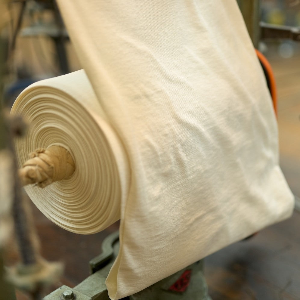 絹肌シリーズは、今では希少となった銅製の釜を持つ、「丸編み機」という編み機で編み上げました。素早く熱を発散する銅の釜で、ゆっくりと低速で編むことで、糸に余計な負担をかけずに編み上げることができます。