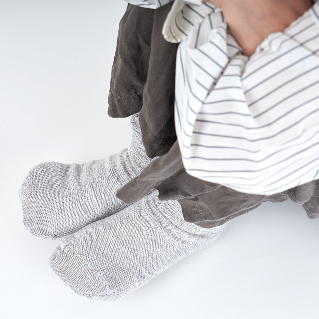 1枚目に履くシルク5本指靴下 はシルクが肌に触れる面積を増やすために長めに。