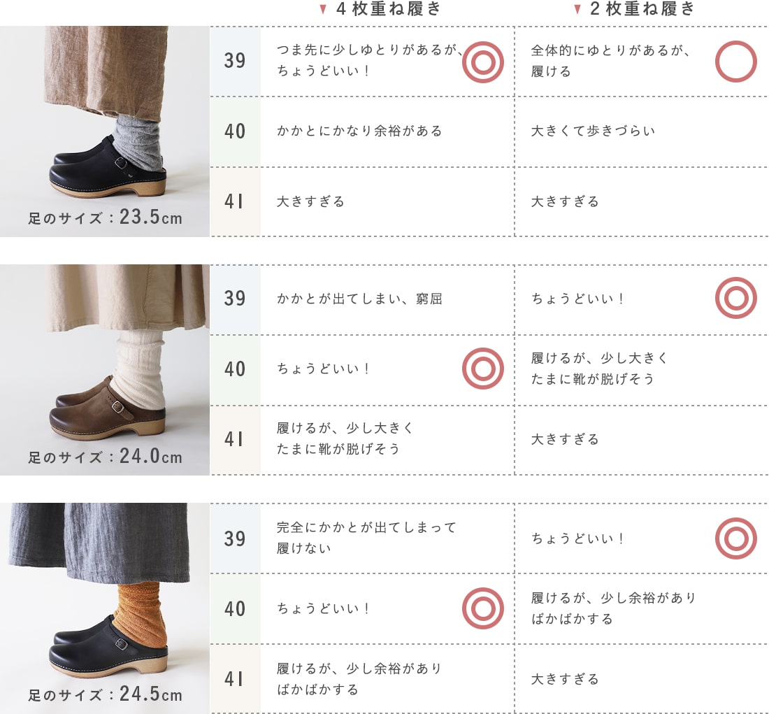 足のサイズが異なる3名のスタッフが、それぞれのサイズを履いてみました。
