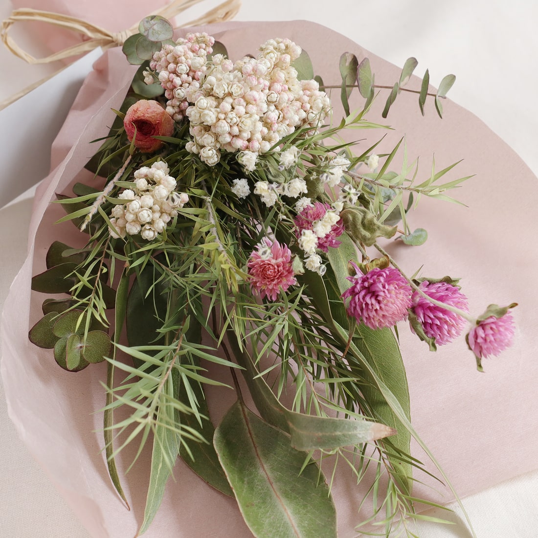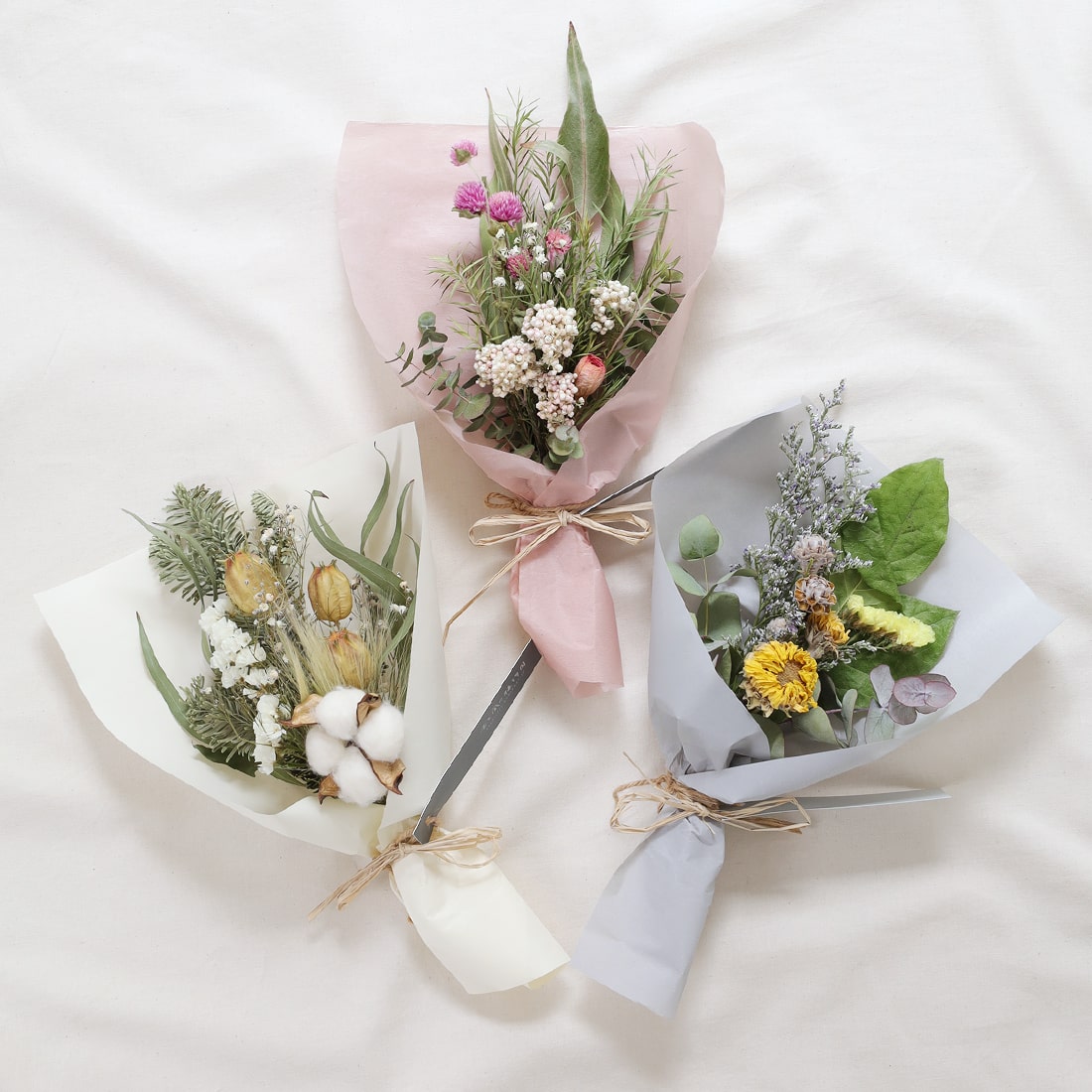 そのときどきの季節に合わせたドライフラワーで、ひとつひとつ丁寧に束ね、梱包しお送りいたします。