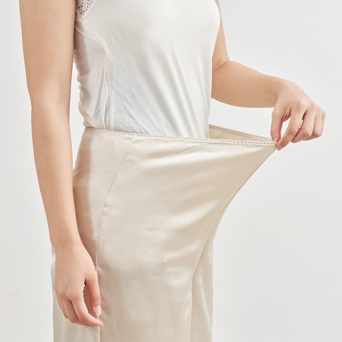 さらにシルクは静電気が起きにくい素材のため、上に重ねるボトムスがぴたっと貼り付いてしまう心配も少ないです。