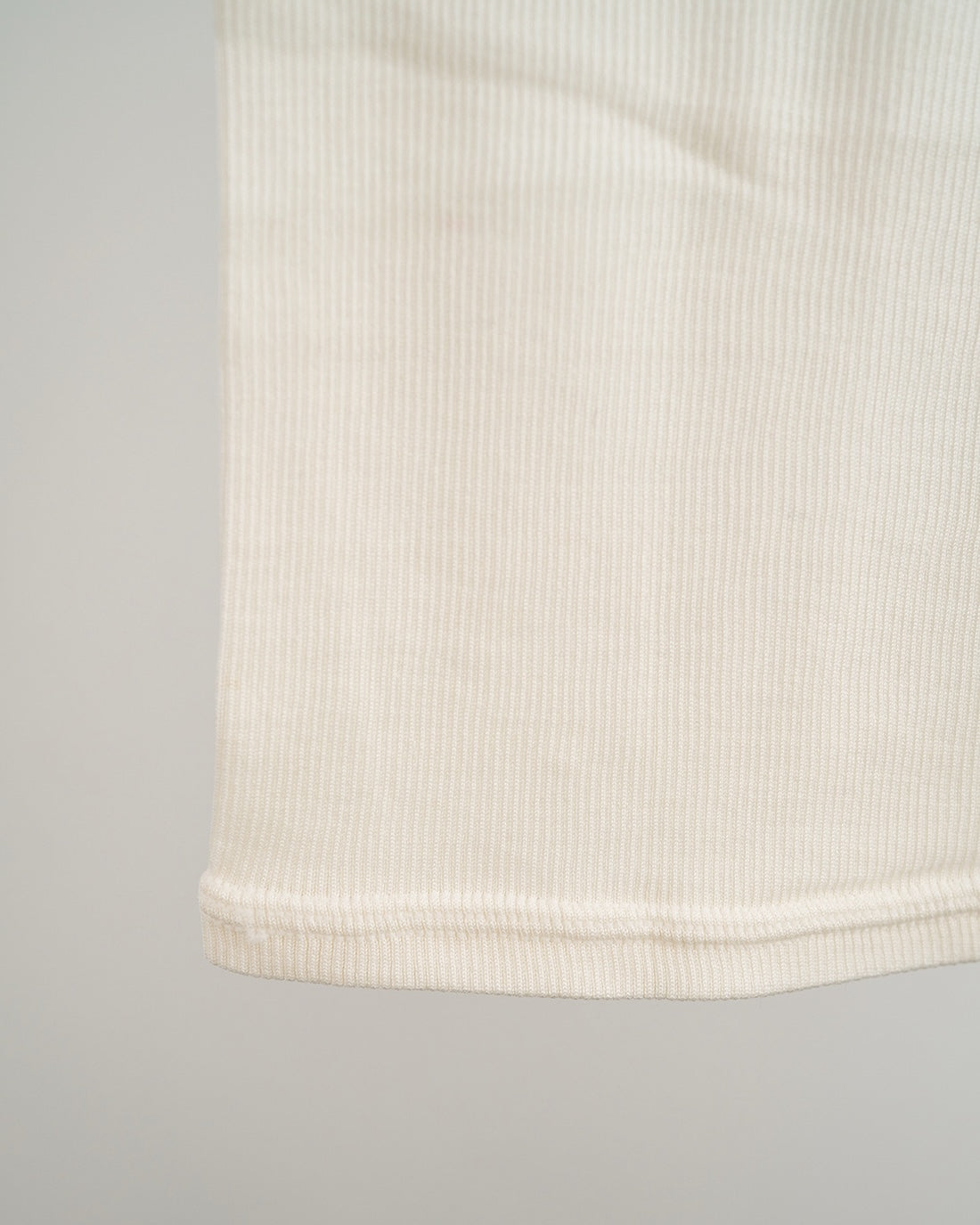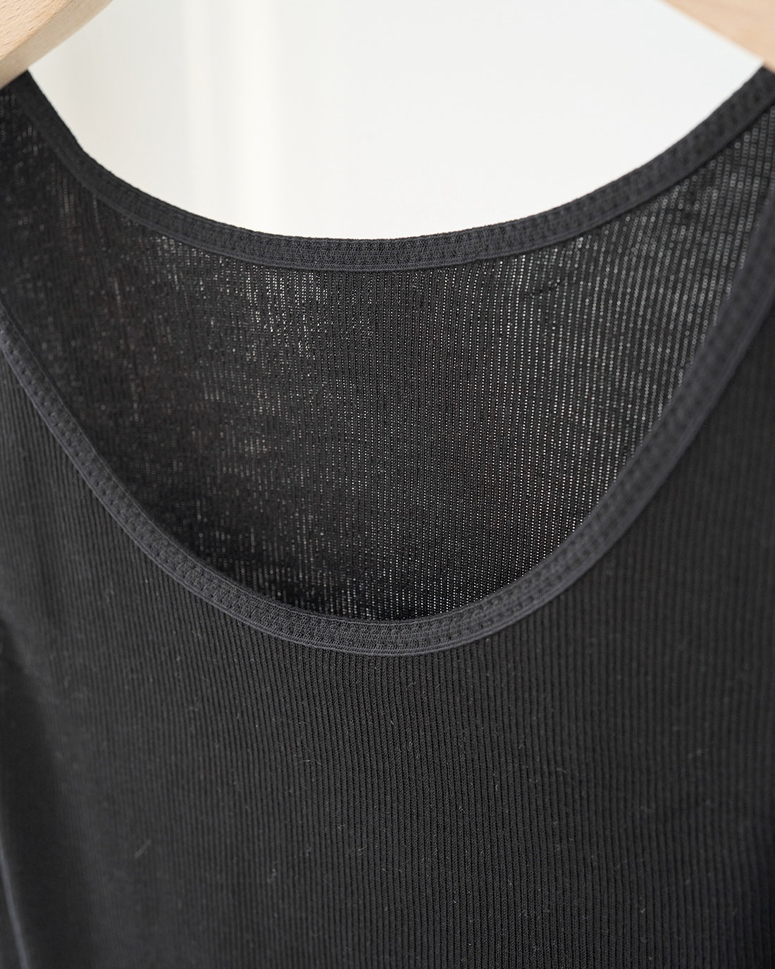 繊細なリブ編み生地が、身体の動きに合わせてとろけるように伸び縮み。肌に吸い付くようにフィットしながらも、締め付け感はゼロ。