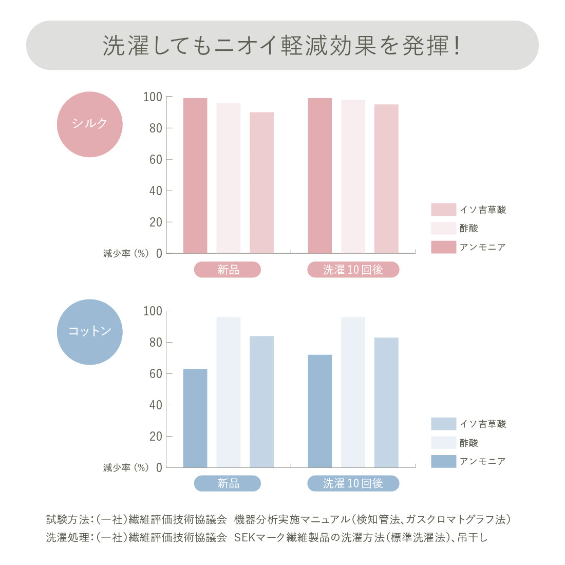 汗を溜め込みやすいコットンと比較した場合、こちらのシルクインナーの方がニオイ軽減効果が高いという結果に。