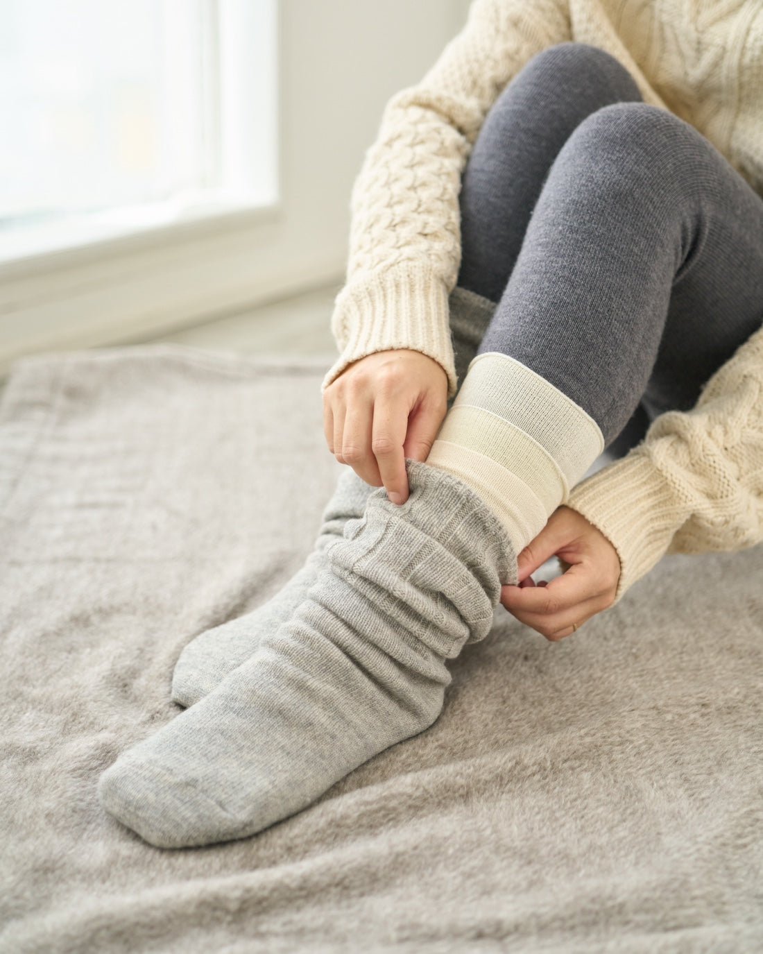 くしゅっとたるませて履いたり、ひざ上まで伸ばしてタイツ風に履いたりと、その日の体調やコーディネートに合わせた使い方ができるのも嬉しいところ。