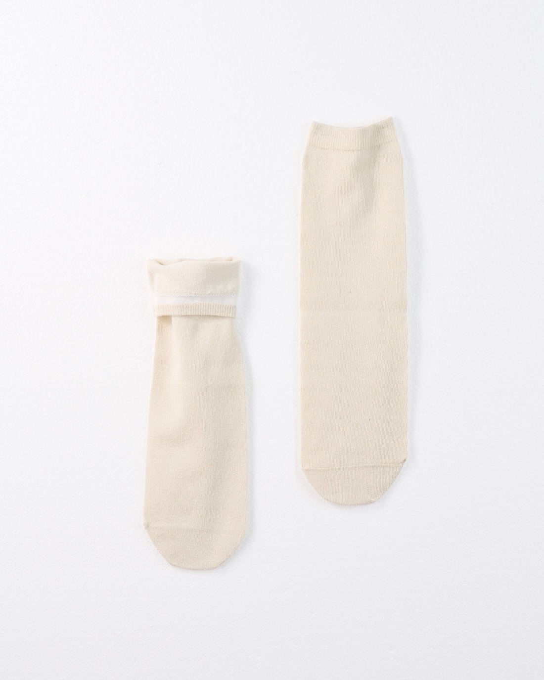 写真の右側が通常のシルク先丸靴下で、左側が紬糸のシルク先丸靴下。