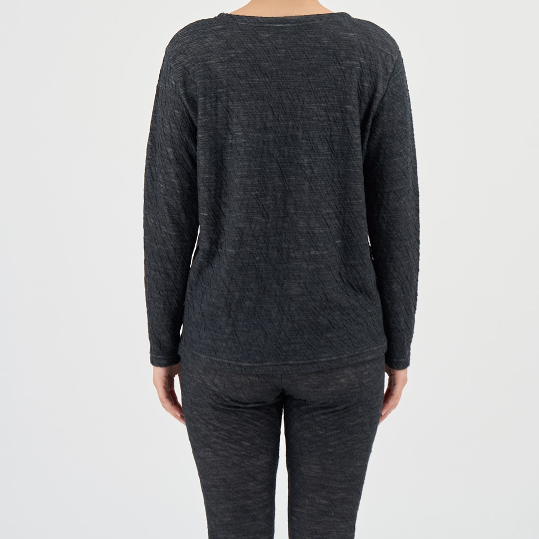 肌側シルク・外側ウールで起伏が生まれるように編み上げたことで、生地の中に空気を含み、蒸れにくく、さらりとした快適な肌触りを実現しています。