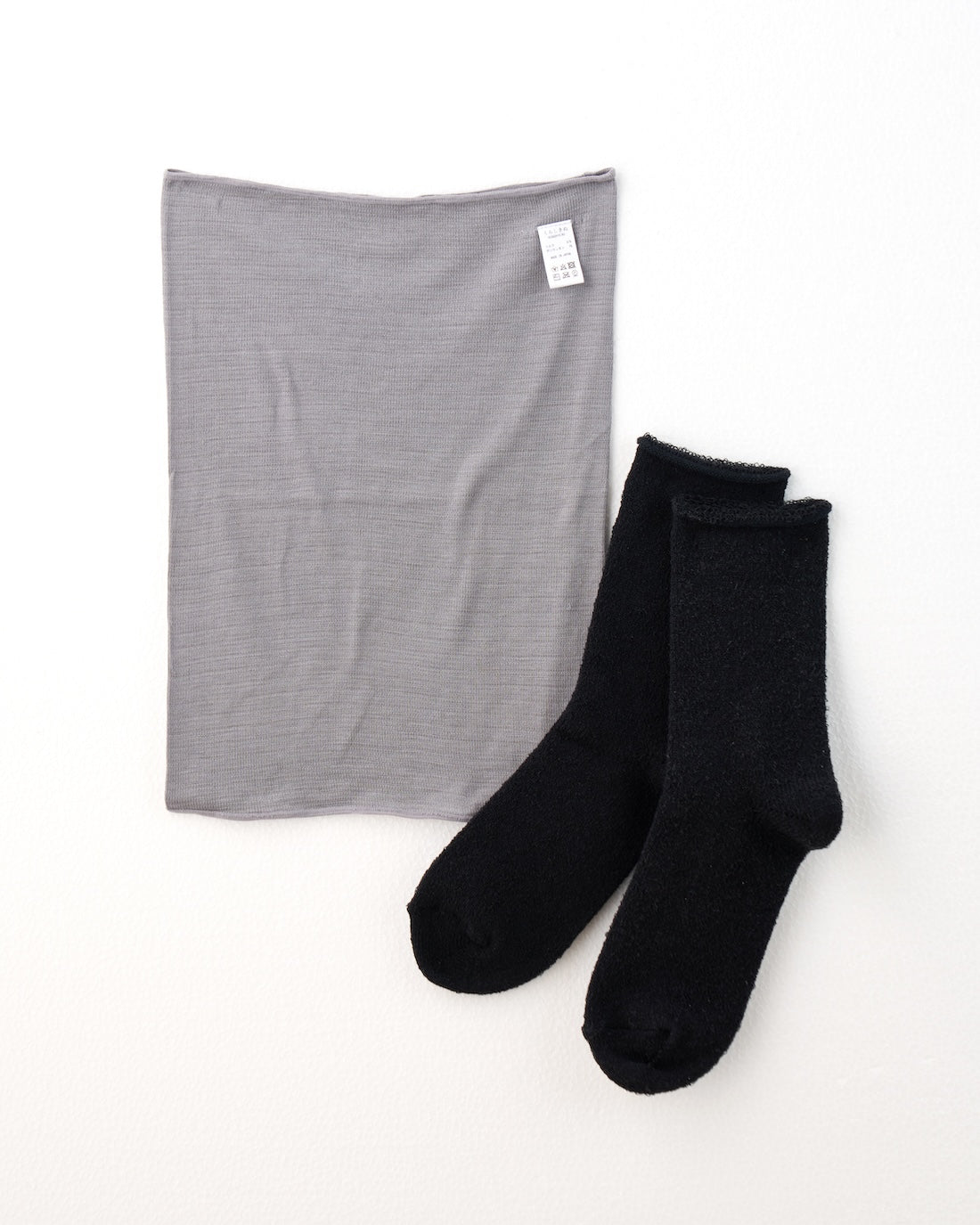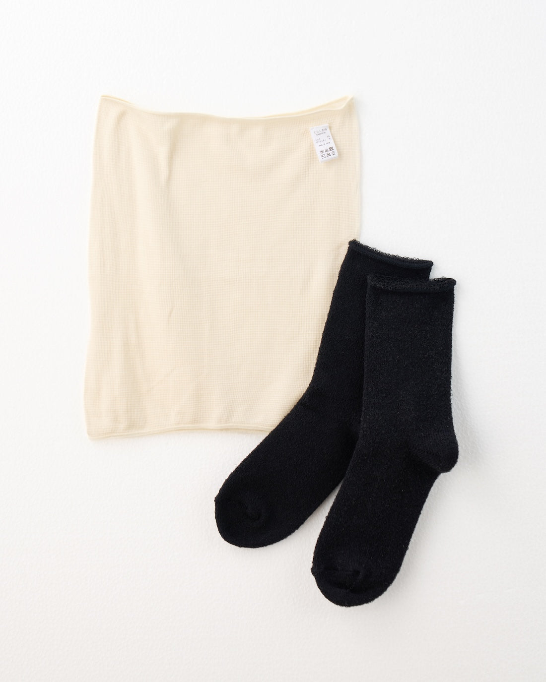 | 素材 | 【シルクはらまき】 シルク 97%、ポリウレタン 3% 【シルク&ウール パイル先丸靴下】 シルク 47%、ウール 42%、ナイロン 9%、ポリエステル 1%、ポリウレタン 1% |