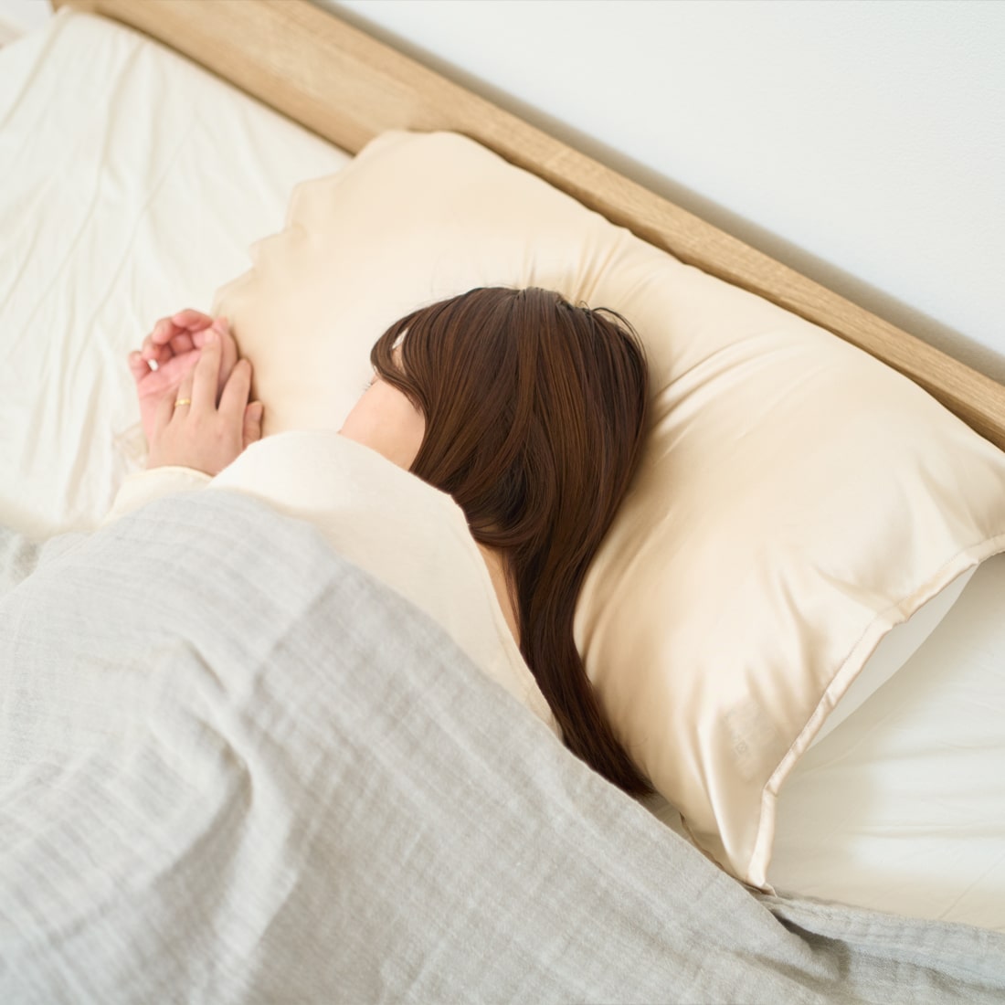 なめらかなシルクが、寝返りによる髪の摩擦を防ぎ、寝ている間もヘアケアを叶えます。