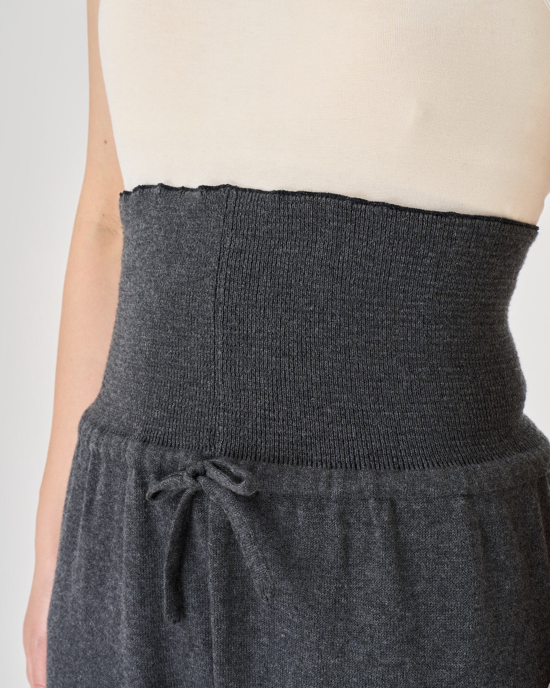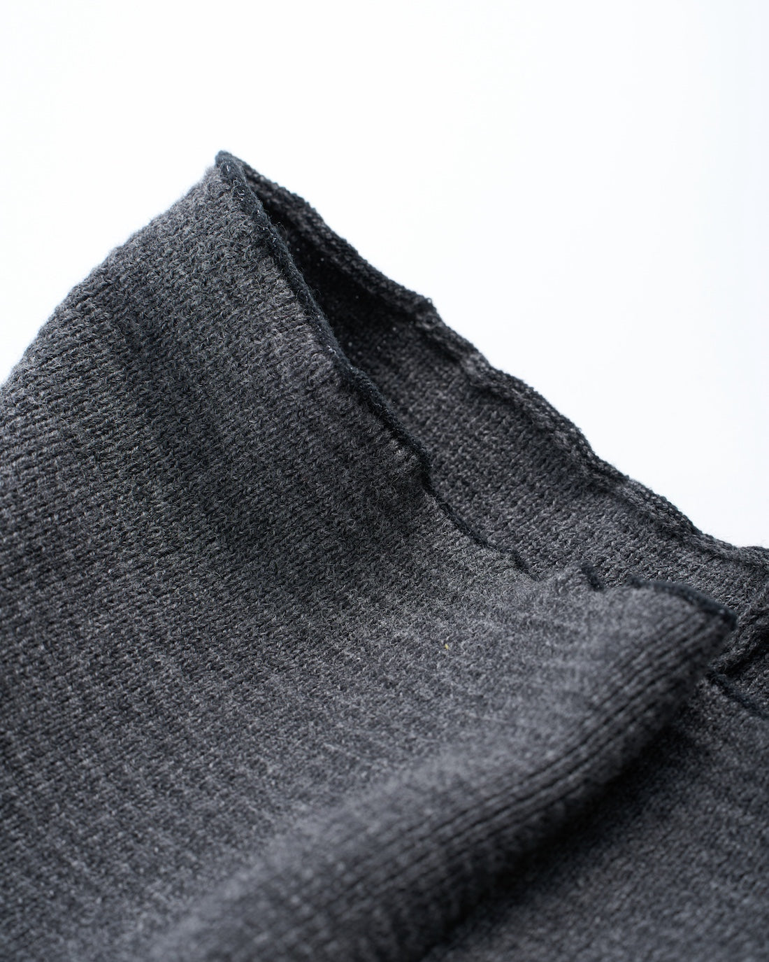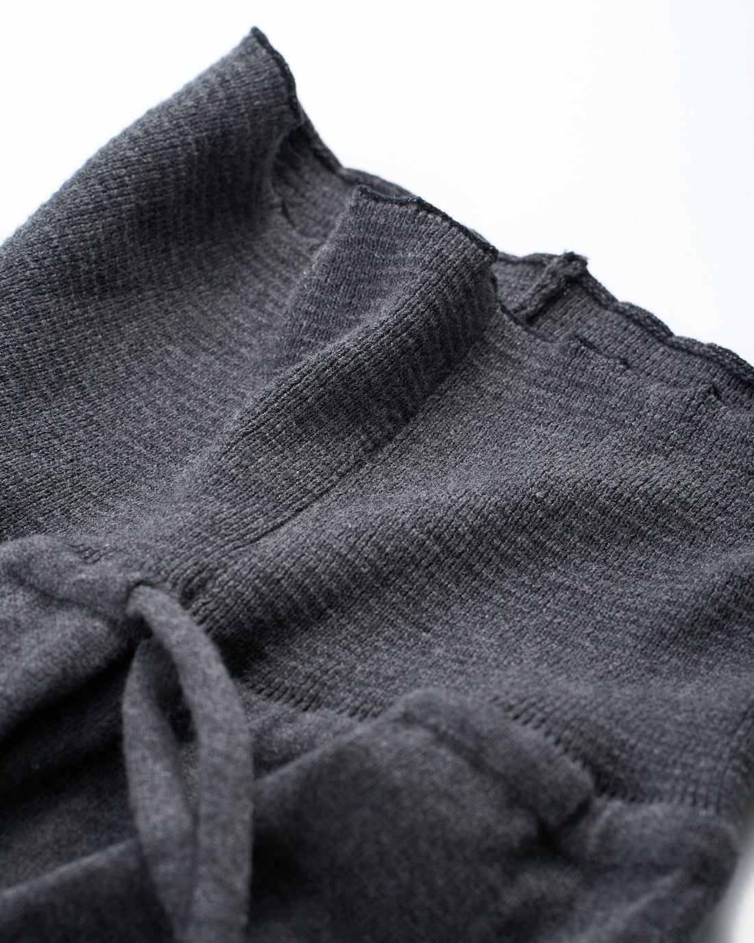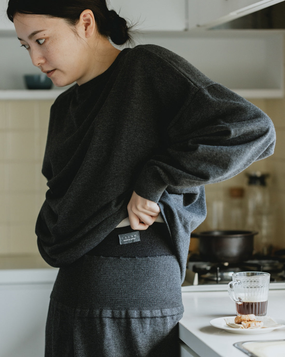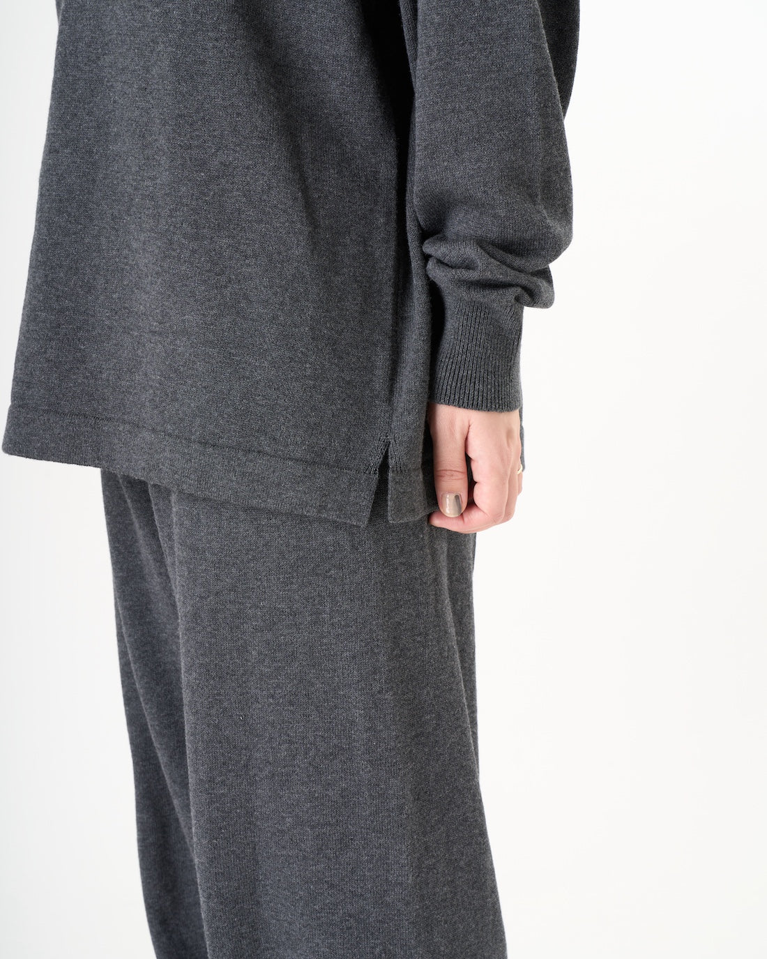 ボトムスと同じ「横編み」仕立てのトップスは、首周りにやさしく寄り添い、絶妙な襟元の開き具合がきちんとした印象を与えてくれるこだわりのデザイン。