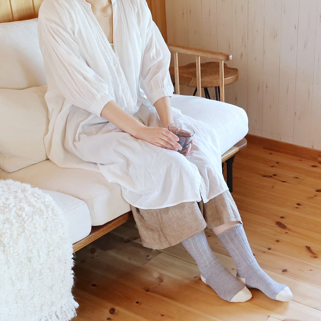 シルクとウールで編んでいるから、履き心地はなめらかで、いつでもぽかぽか。