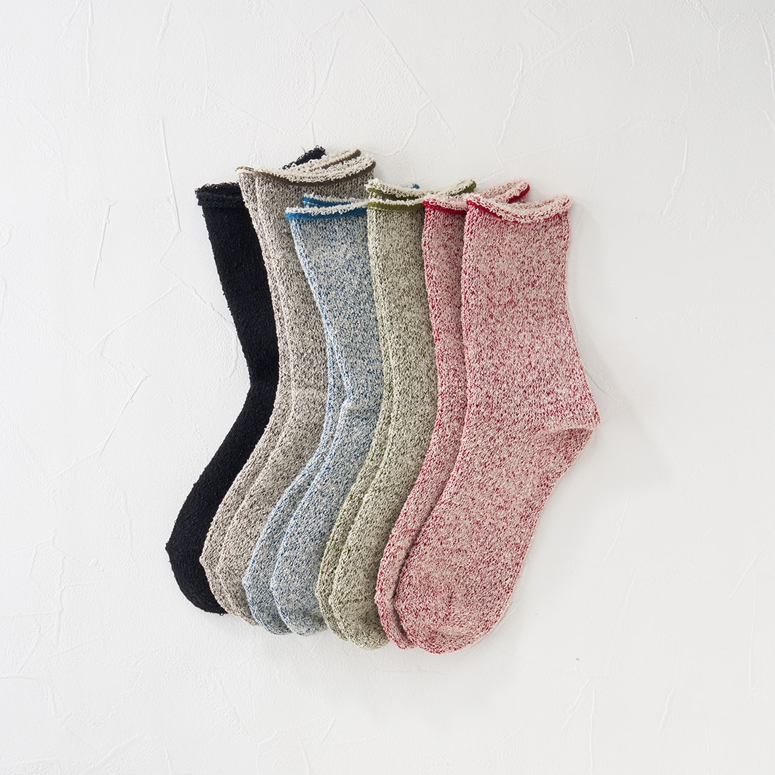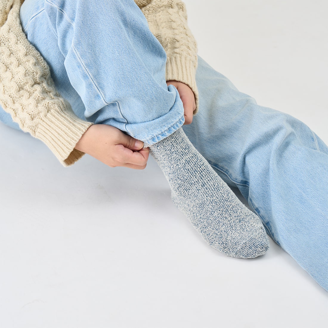 締め付けを感じにくいように編み立てているので、リラックスしたい時にぜひ履いていただきたいです。
